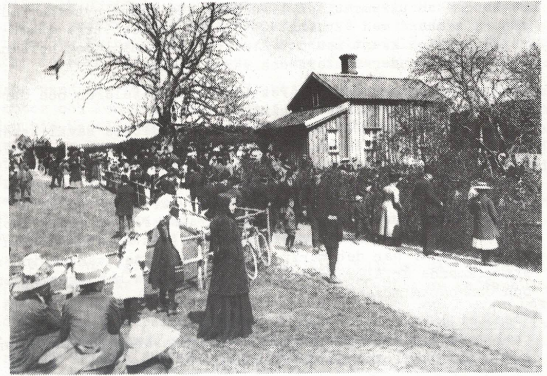 Ur Munkedalsbygden 79-4. Wiknerstugan vid Kaserna 1912 i samband med avtäckningen av stenen